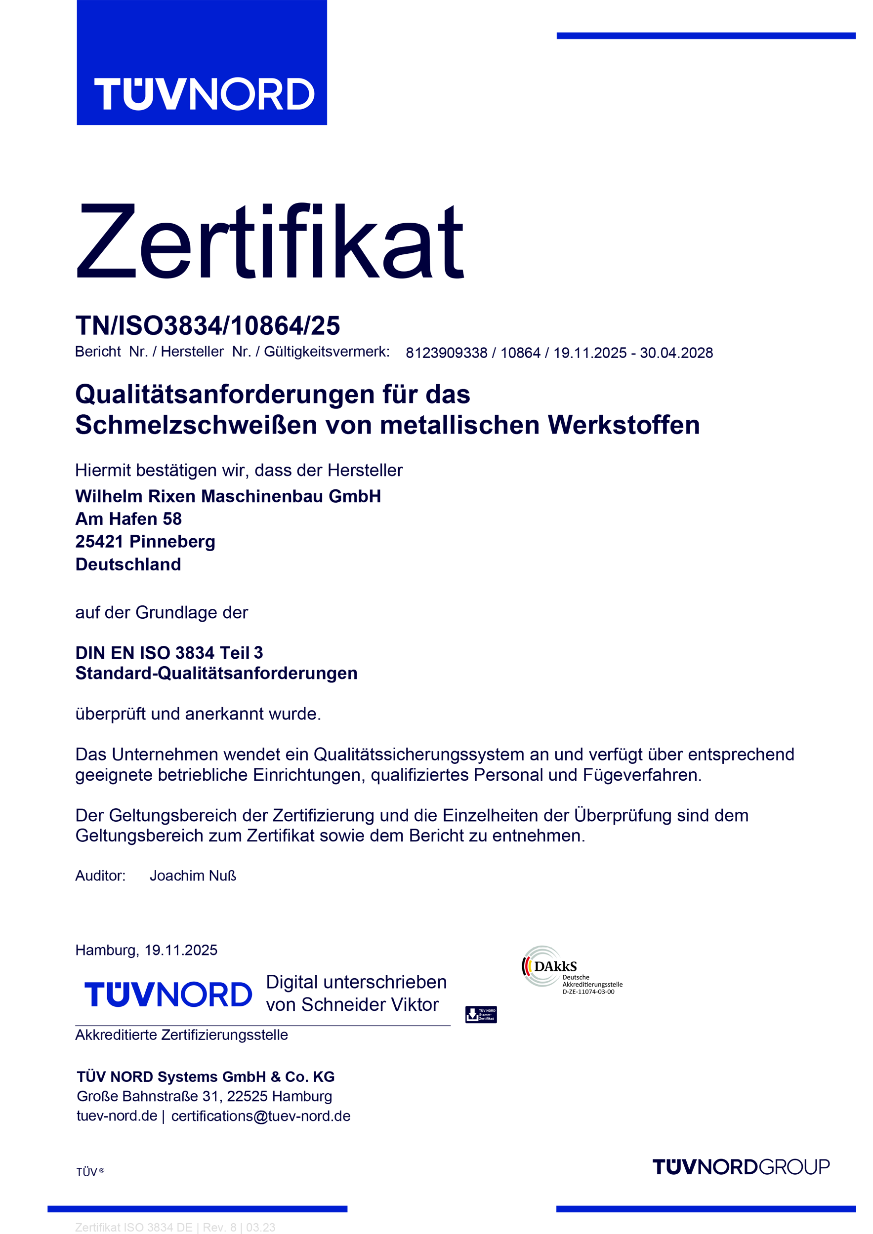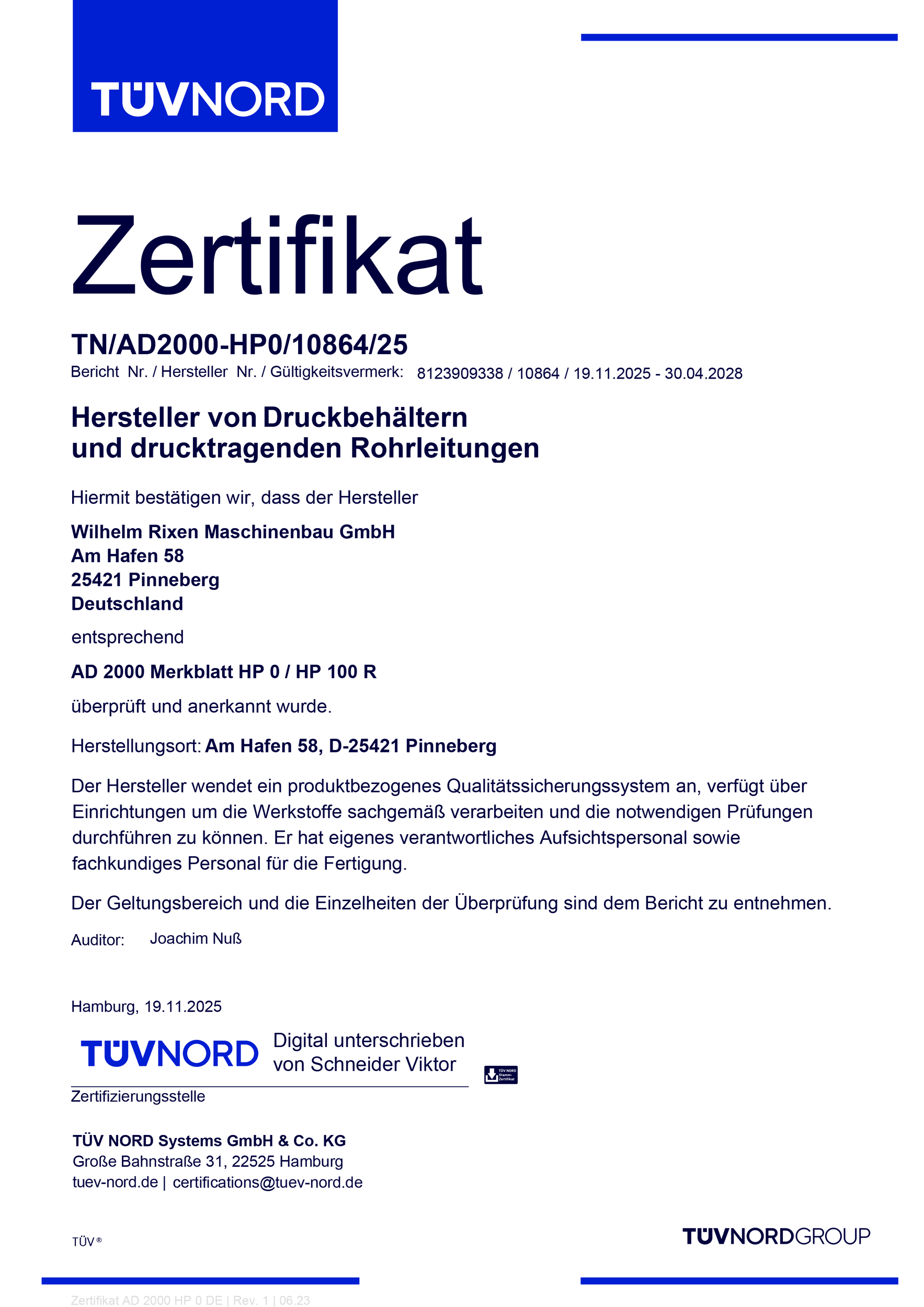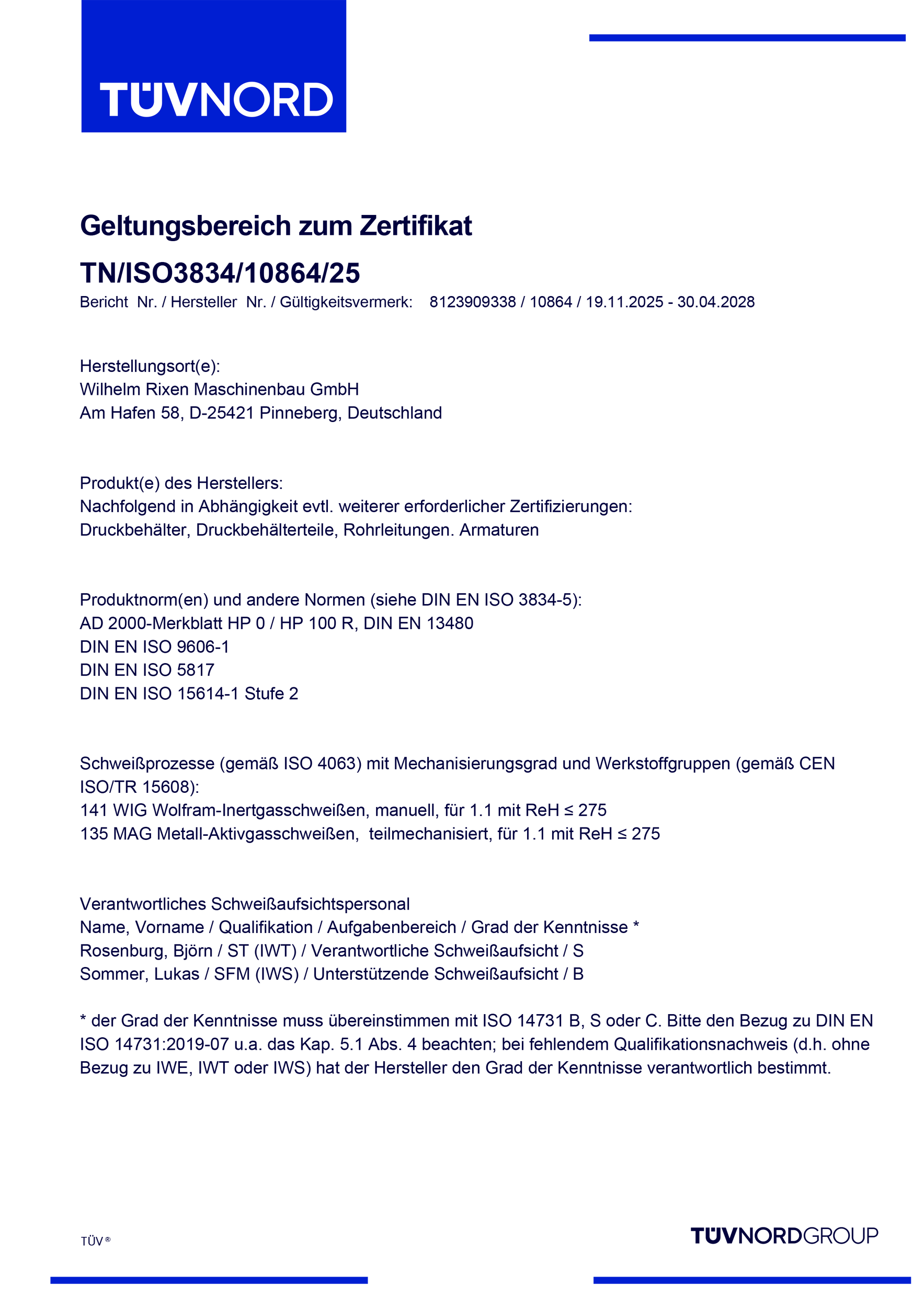 Nach erfolgreicher Zertifizierung darf sich die Wilhelm Rixen Maschinenbau GmbH seit 2022 „Zertifizierter Schweißfachbetrieb für Druckgeräte“ nach DIN EN ISO 3834-3 sowie AD 2000 HP0 nennen.
